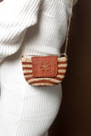 Mini Raffia Crochet Bag featuring a coloured flap adorned with a tip of a Baobab tree gold clasp and gold stainless steel chain. Fits AirPods, credit cards, and other small daily essentials. Can be worn on the shoulder or as a crossbody. Closure with an inside magnet pressure button.