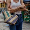 This mini basket-type crossbody handbag is perfect for everyday use, with plenty of space for all your essentials. Closed with a strap and button over the front. Easy to carry with either the light gold handles or the shoulder strap, which matches the striking two-tone striped design of the bag. Inside, you'll find an internal flat pocket and beautiful high quality lining that is exclusive to Good People.