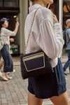 Mini bag made to be worn during the day, throughout the night. Fits a large phone and a wallet along with other essentials. Can be worn by the handles as a chic purse, or with one of the straps. Closure with internal magnet, flat pocket inside.